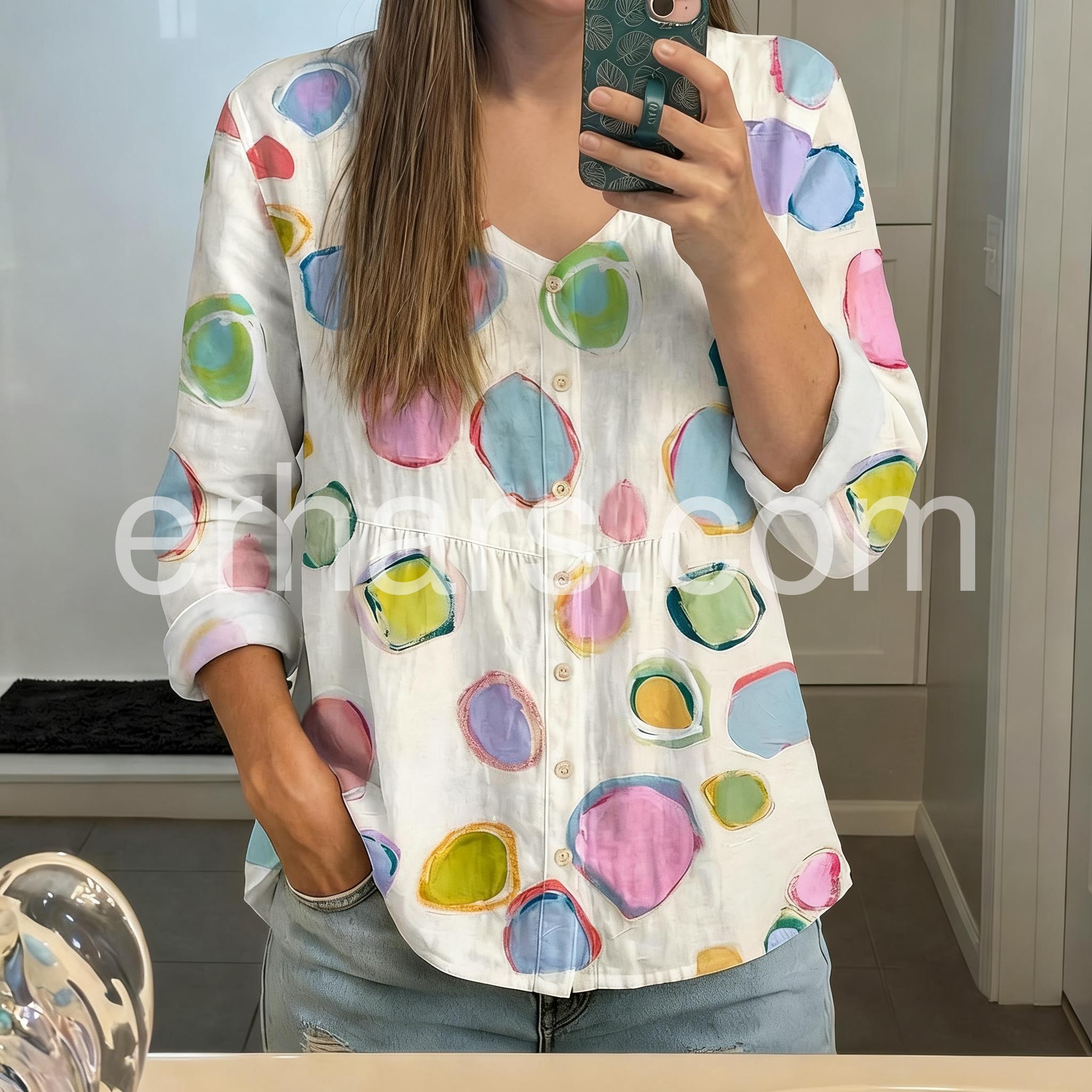 This blouse features a vibrant watercolor-style polka dot print on a soft white base. The relaxed fit and button-down front add casual charm. Rolled sleeves and side pockets enhance comfort. Perfect for pairing with jeans or shorts. Ideal for spring and summer days.