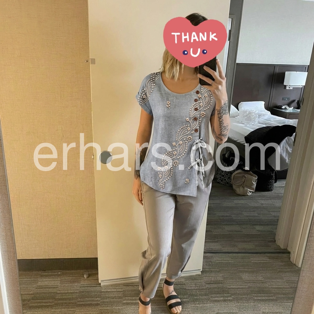 Perfect boho top! The grey color is very versatile. I love the short sleeves and the overall airy feel. I washed it twice already and the embroidery held up perfectly.