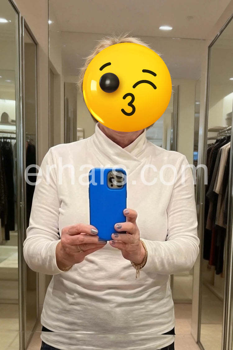 Gorgeous design! The criss-cross mock neck makes it stand out from all the other long sleeve shirts in my closet. It is very versatile; I can wear it tucked into trousers for work or with dark denim for dinner.