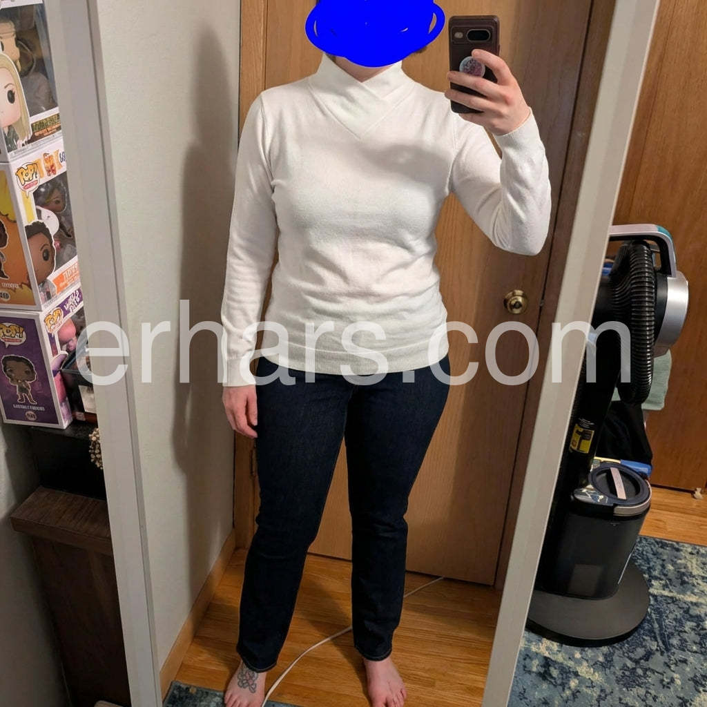 Absolutely in love with the neckline. It frames the face beautifully without feeling as constricting as a traditional turtleneck. I paired it with a black leather skirt like the model and it looked stunning. Will be buying more colors if available!