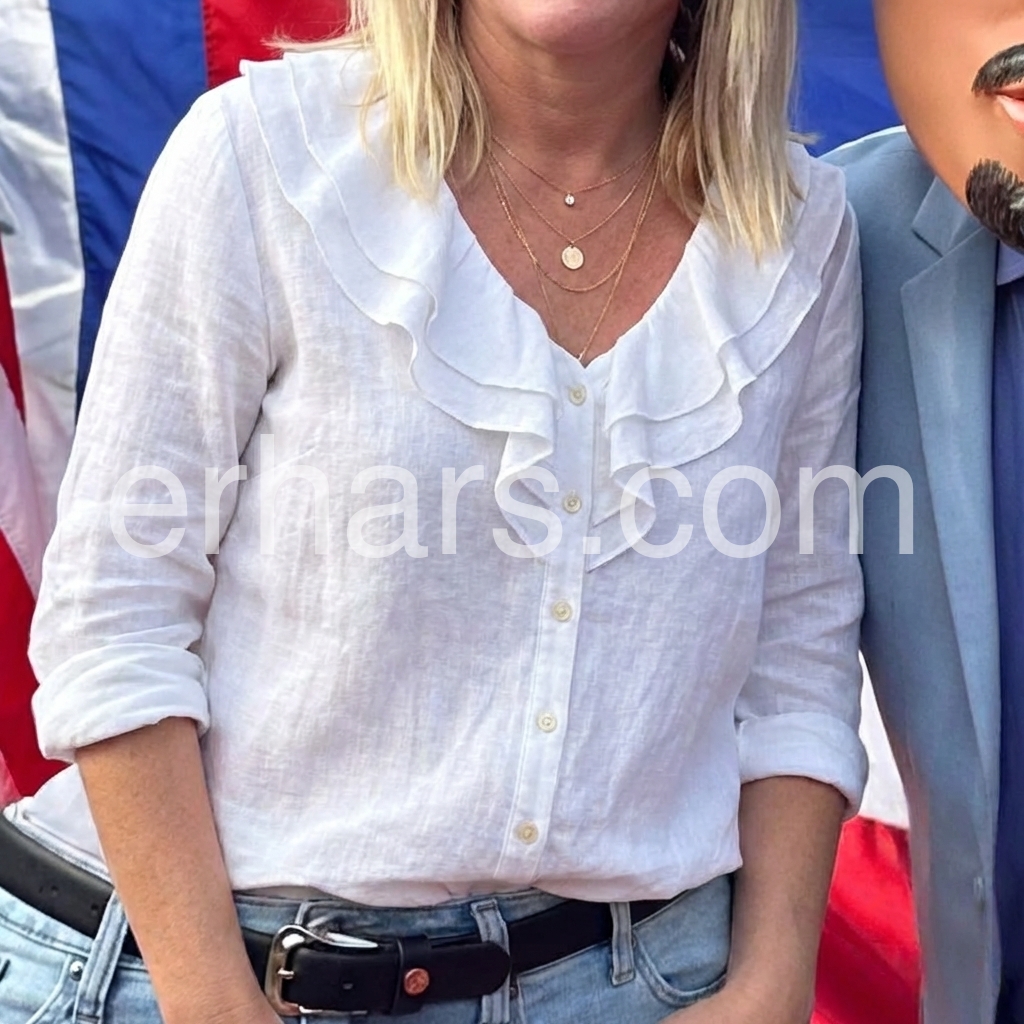 This white linen blouse features a delicate ruffled V-neckline and front button closure for a soft, romantic look. The lightweight fabric offers breathability and comfort, perfect for warm days. Rolled long sleeves add a relaxed touch, ideal for casual or semi-formal wear. Pair with jeans or tailored pants for effortless style. A timeless piece with a feminine flair.