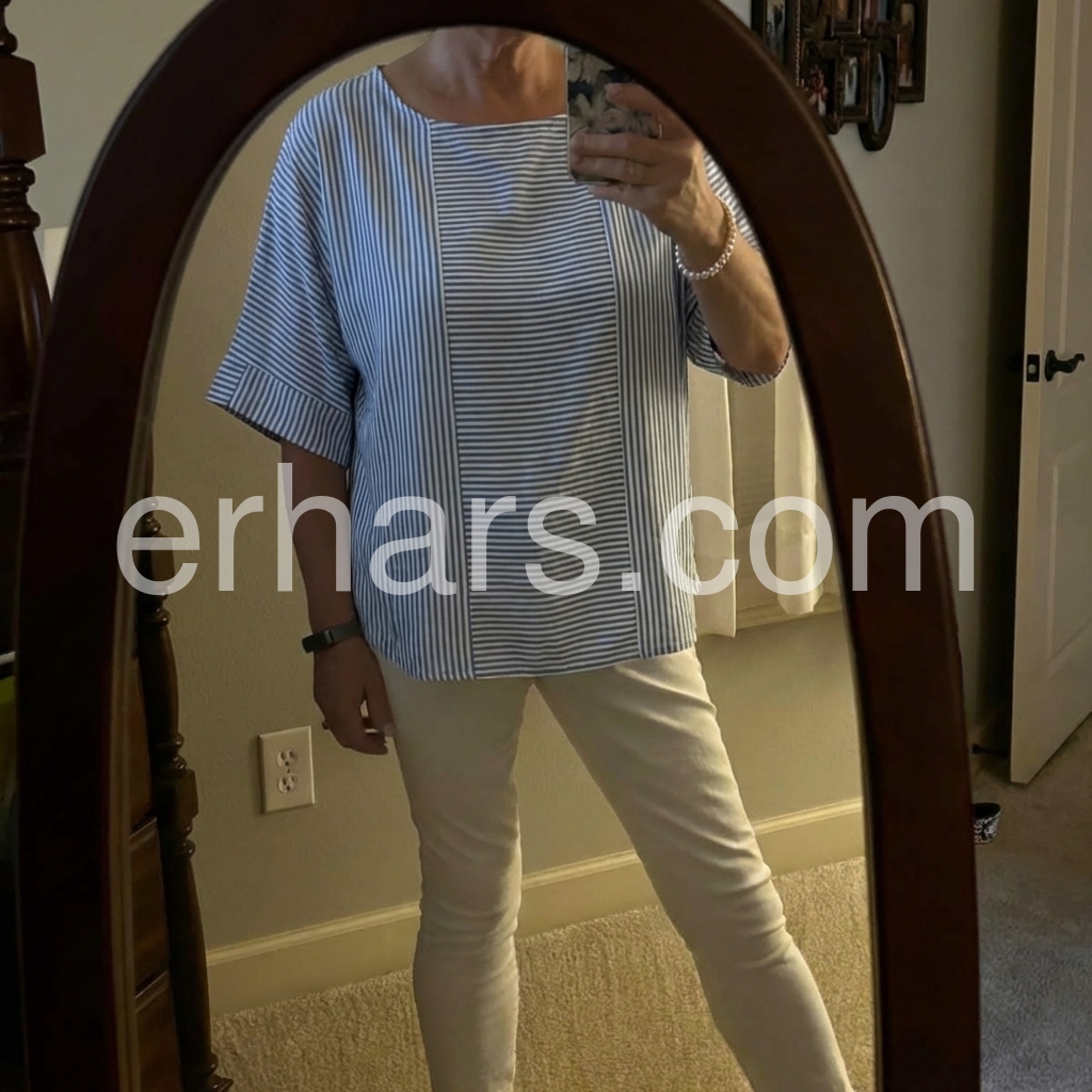 I created this blouse to solve the "boring striped top" pain point. The batwing sleeves hide arm fat, while the vertical stripe panel slims the torso, creating a flattering silhouette.