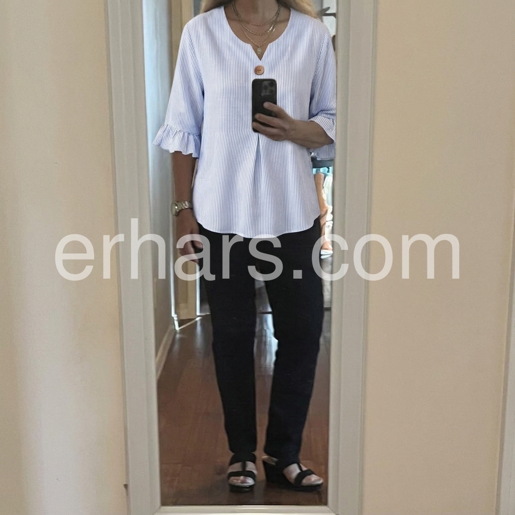As a designer, I crafted this blouse to solve the common pain point of "too casual or too formal" daily tops. The notched V-neck flatters all necklines, while the ruffled cuffs add a feminine touch without being overly frilly.