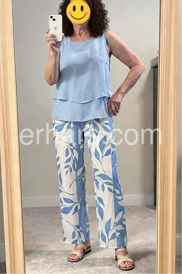 Blue Plant Print Square Neck Two Piece Set