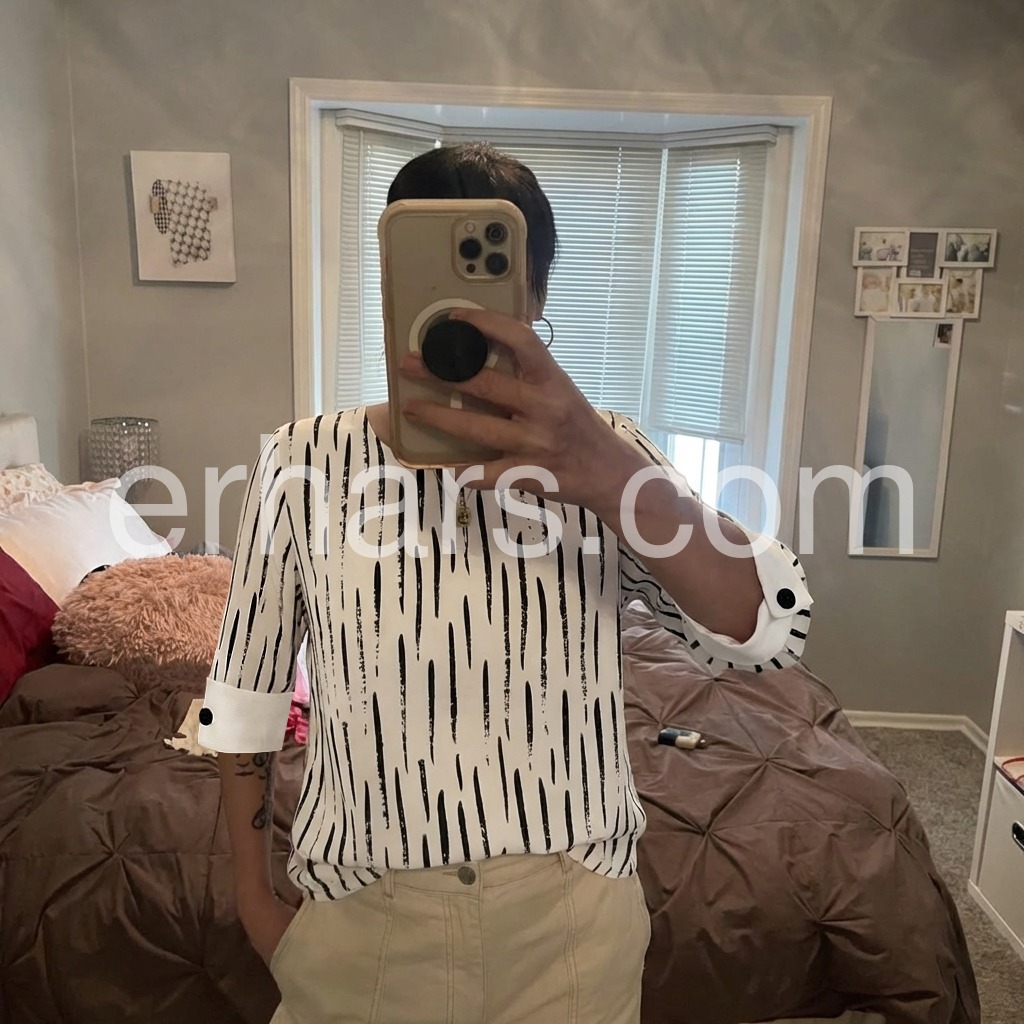 Wore this out to brunch and got so many compliments. The brush stroke stripes are unique and slimming. The folded cuffs with the black button are a really cute detail. Highly recommend!