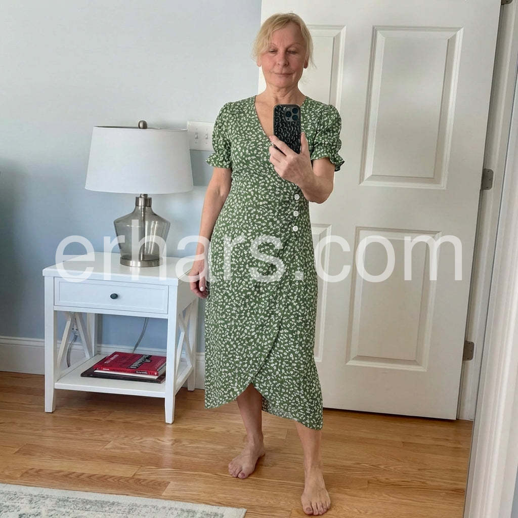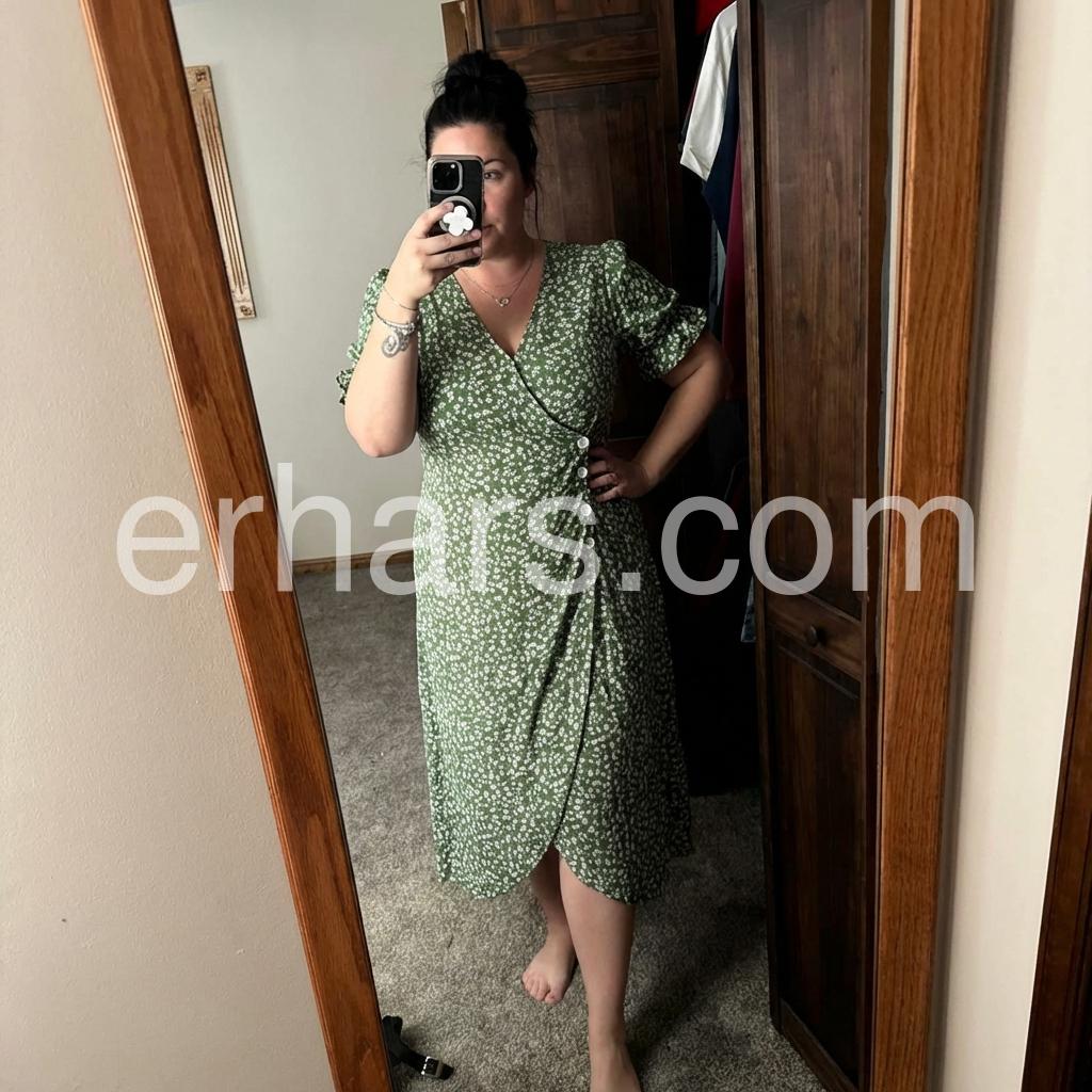 I absolutely love this dress! The green color is so vibrant and the floral print is perfect for spring. The faux wrap style is super flattering on my figure, hiding my tummy area perfectly. Highly recommend!