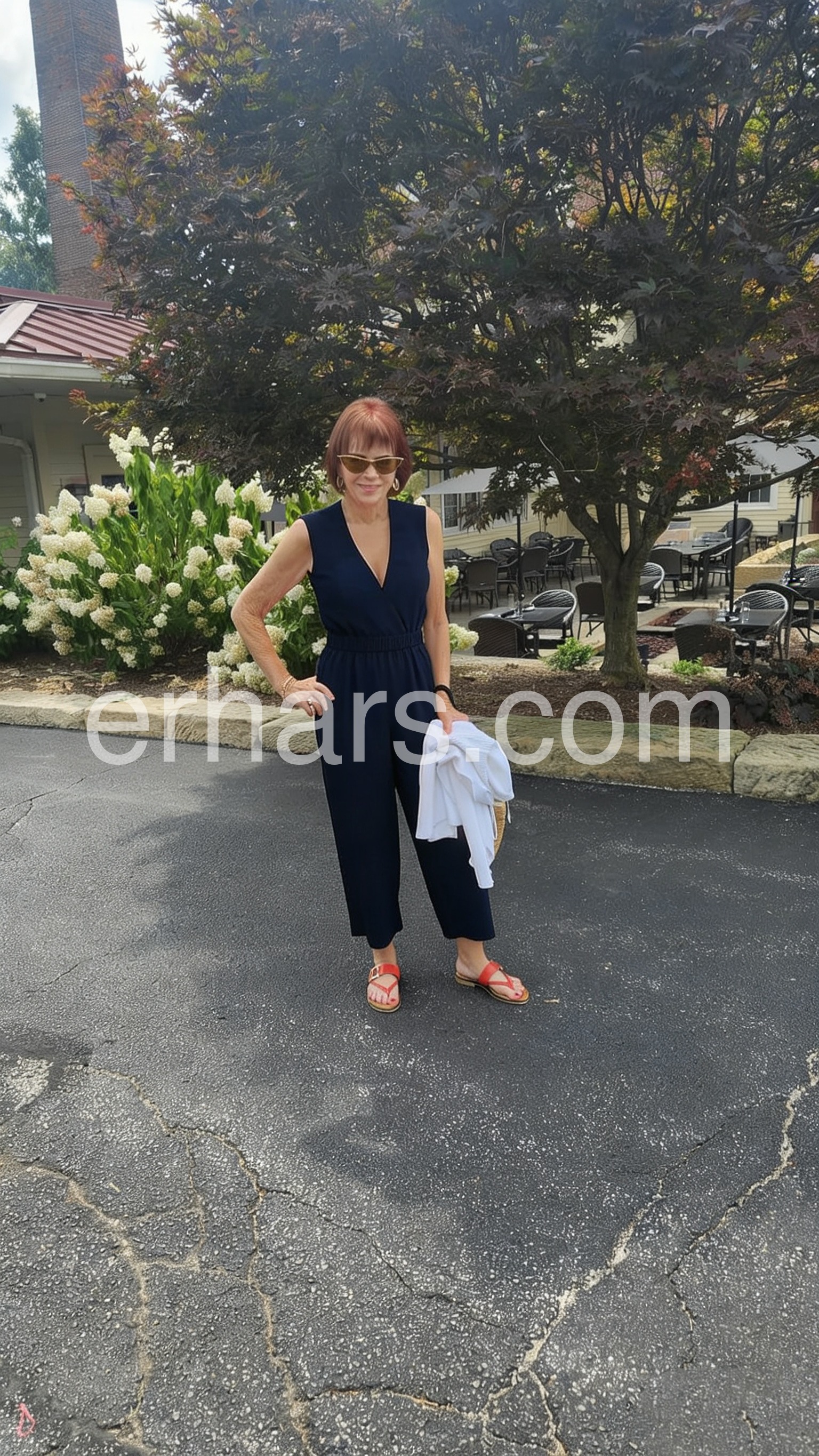 This sleeveless jumpsuit features a deep V-neckline and a flattering cinched waist for a sleek silhouette. The wide-leg, cropped pants add a contemporary touch. Made from smooth, stretchy fabric for comfort and ease. Perfect for office wear or evening events. Timeless navy blue pairs effortlessly with heels or flats.