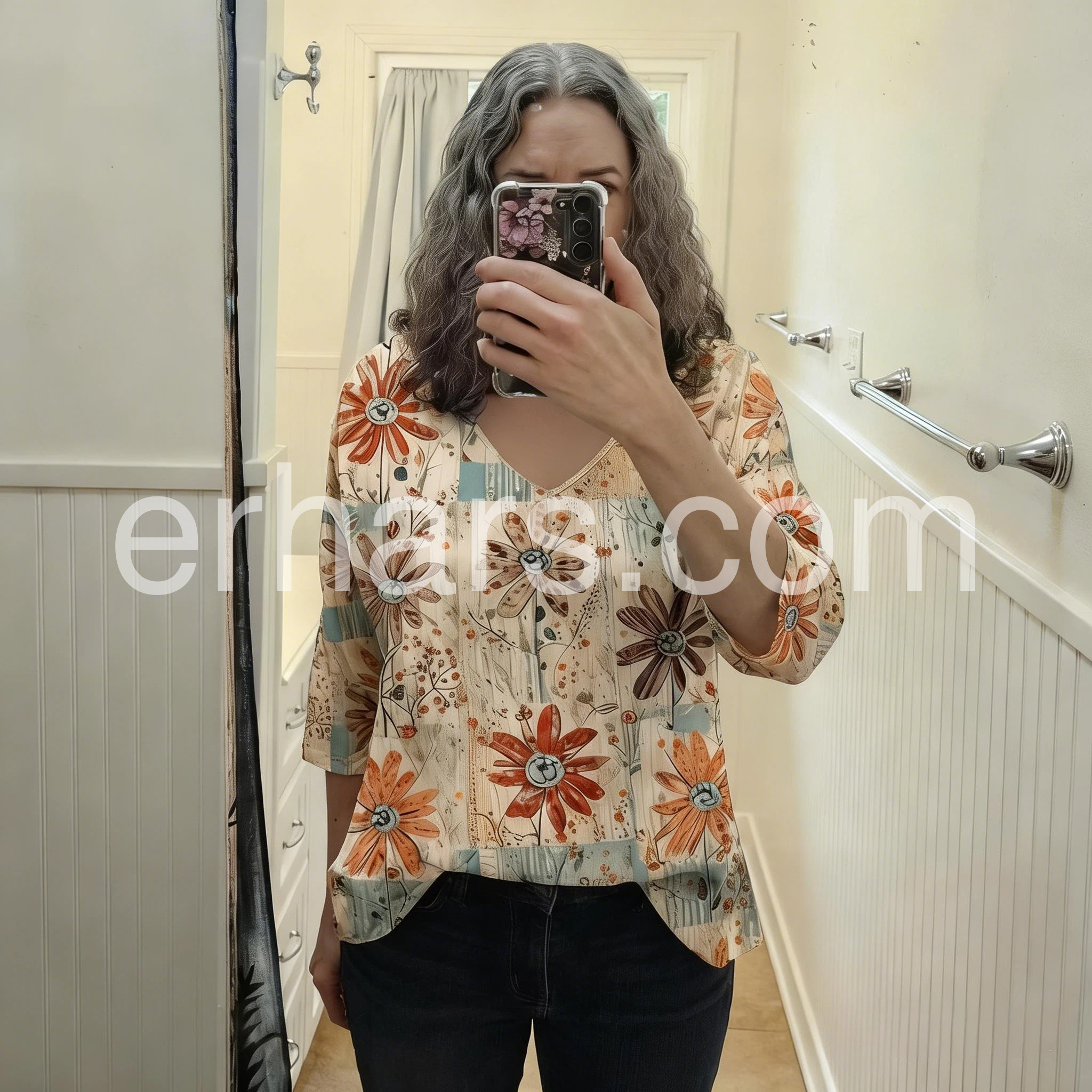 The relaxed V-neck fit and 3/4 sleeves ensure all-day comfort, perfect for elevating everyday outfits with timeless style.