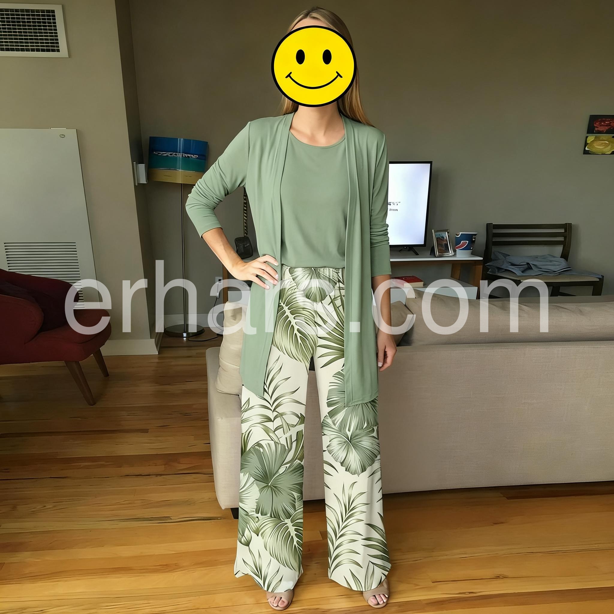 Beautiful outfit! The tropical leaf print on the pants is so vibrant and matches the solid sage green top exactly. It feels like wearing pajamas but looks chic and put together. Washing it was a breeze, no shrinking.