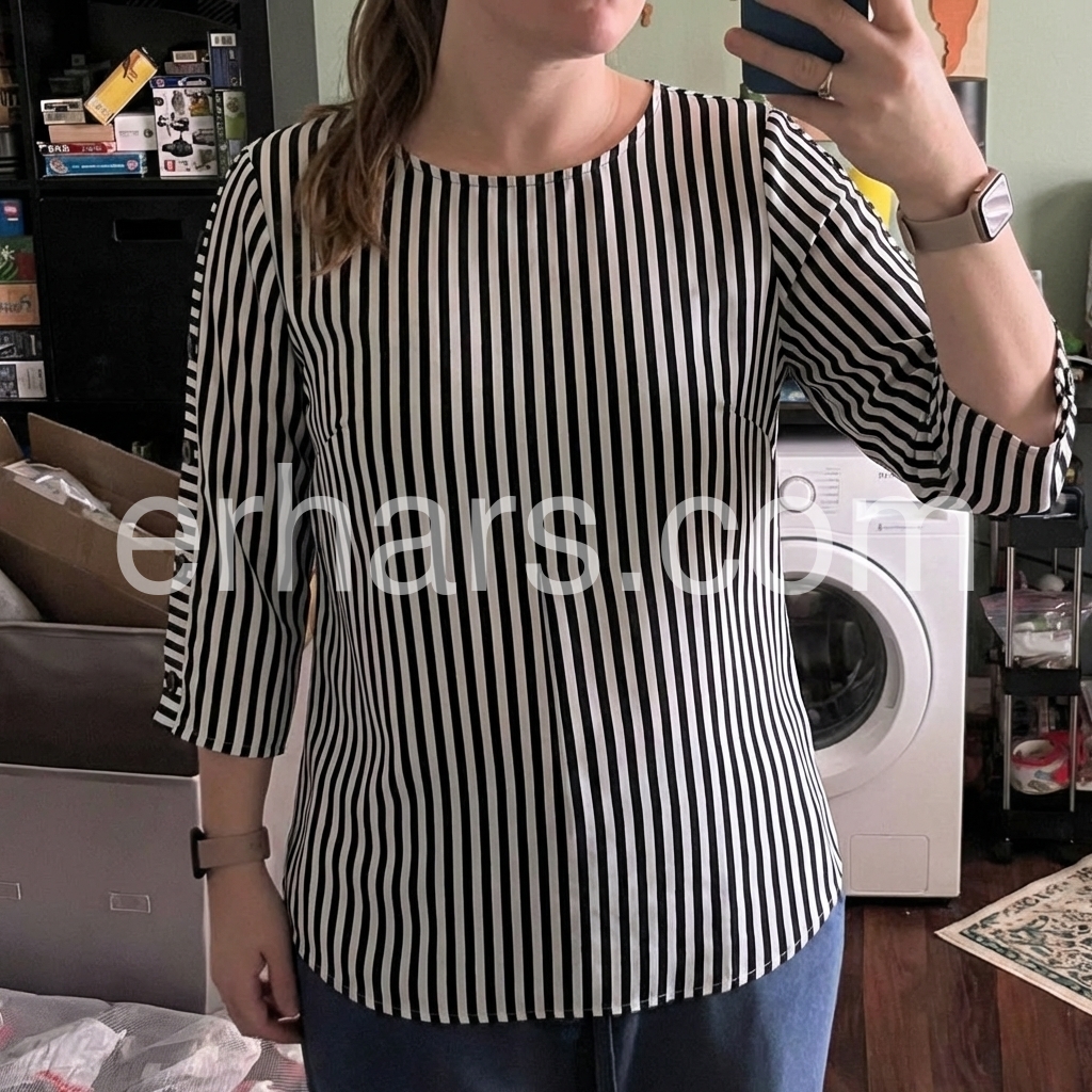 I absolutely love this top! The vertical stripes are incredibly slimming and the fit is just loose enough to be comfortable without looking baggy. The button details on the sleeves add a really cute touch. Perfect for work or a casual day out.