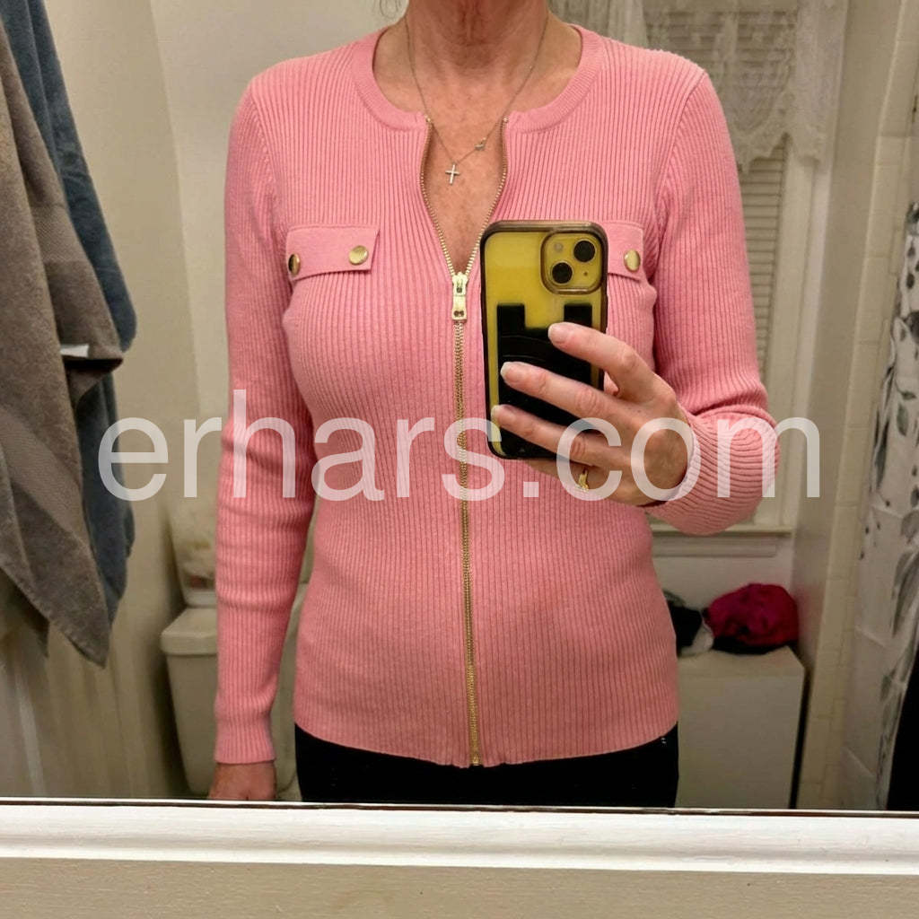 Elevate your wardrobe with our Sweet Pink Plain Zip V-Neck Knit Top. The soft knit material's luxurious feel makes it perfect for all-day comfort, while the modern V-neck and zip design adds a touch of sophistication. Upgrade your style with this classic and versatile top.