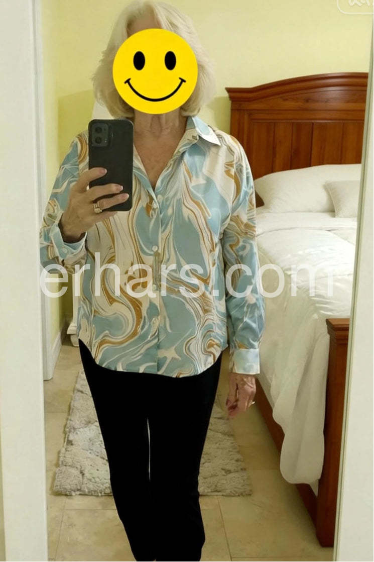 Such a pretty blouse. I love layering necklaces with it unbuttoned at the top just like the model. The material is very forgiving and comfortable for all-day wear. The gold and blue swirl design is eye-catching but not overwhelming.