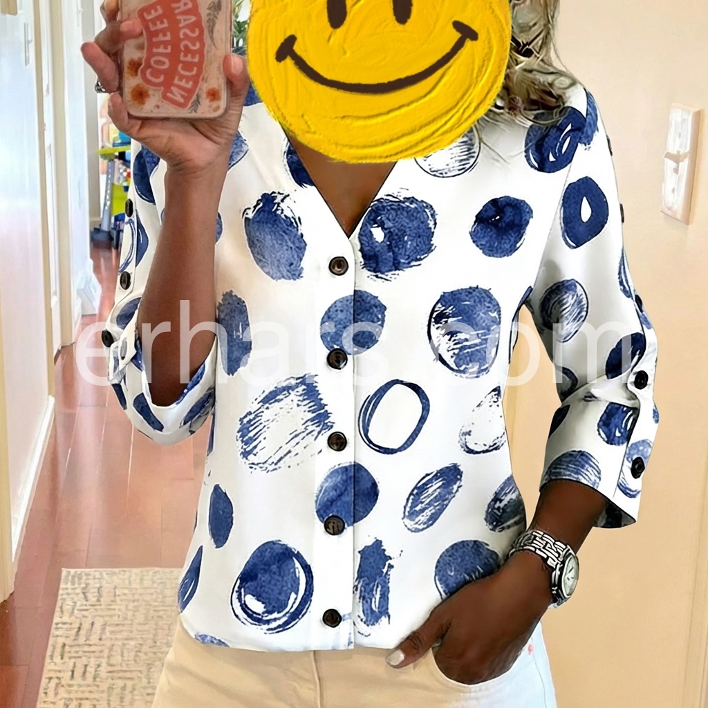 This V-neck blouse features a bold blue abstract dot print on a white background. Button-down front with three-quarter sleeves and button cuffs. Relaxed fit perfect for casual wear. Ideal for pairing with jeans or shorts. Modern and eye-catching design.