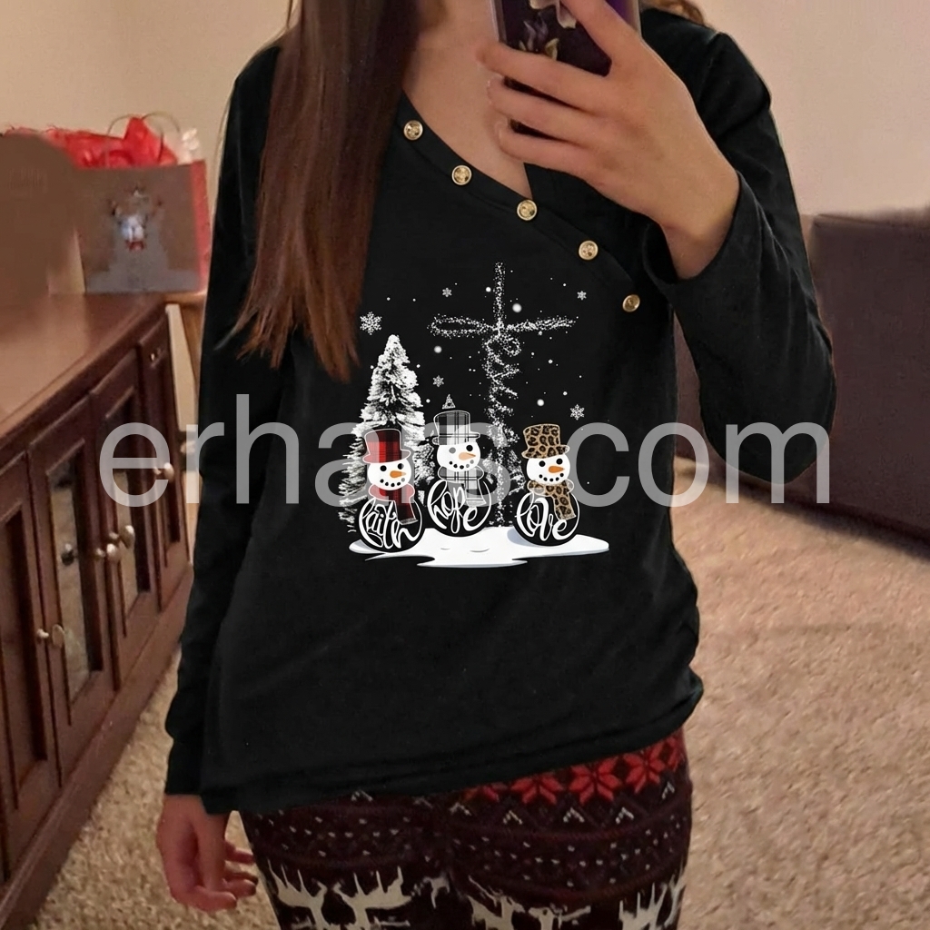 Add this cozy long sleeve top to your winter wardrobe, featuring adorable snowmen and a Cross, a Christmas tree, and falling snowflakes that set the stage for a super-fun holiday party, Christmas vacation, and so much more. An asymmetrical button front collar gives it a contemporary vibe.