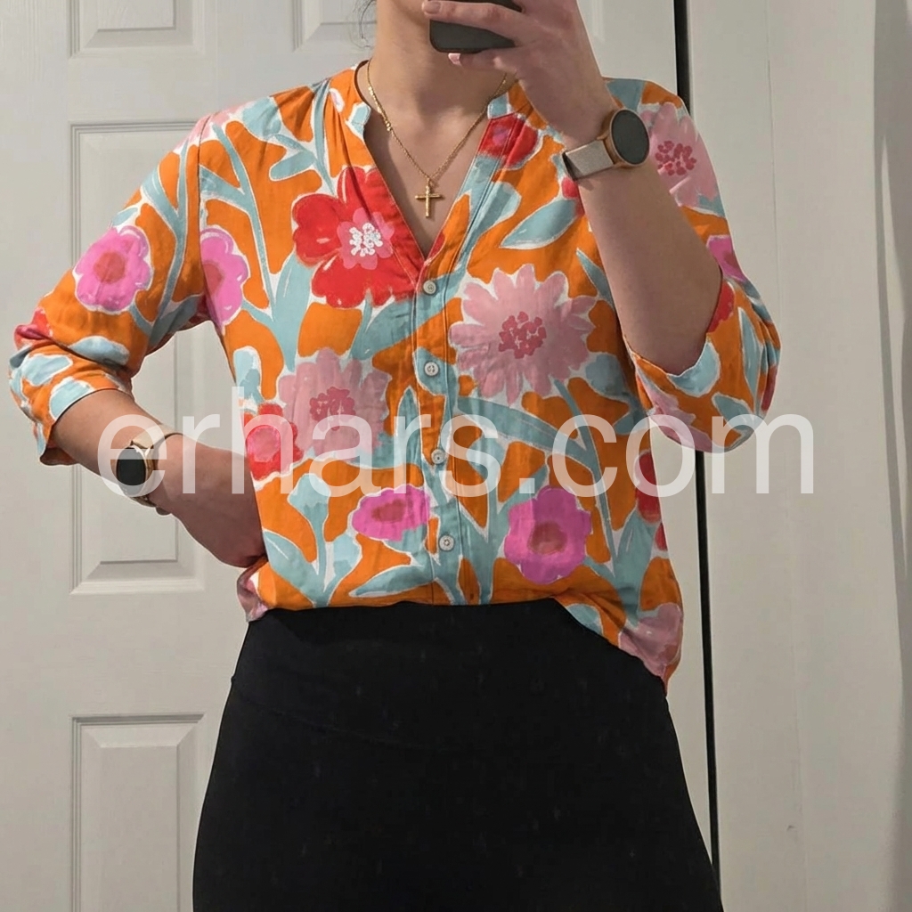 This top is a must-have. The floral pattern is so unique and striking. I love how it looks tucked slightly into the front of my jeans. It is incredibly comfortable and washes up really well. No shrinking or fading so far.