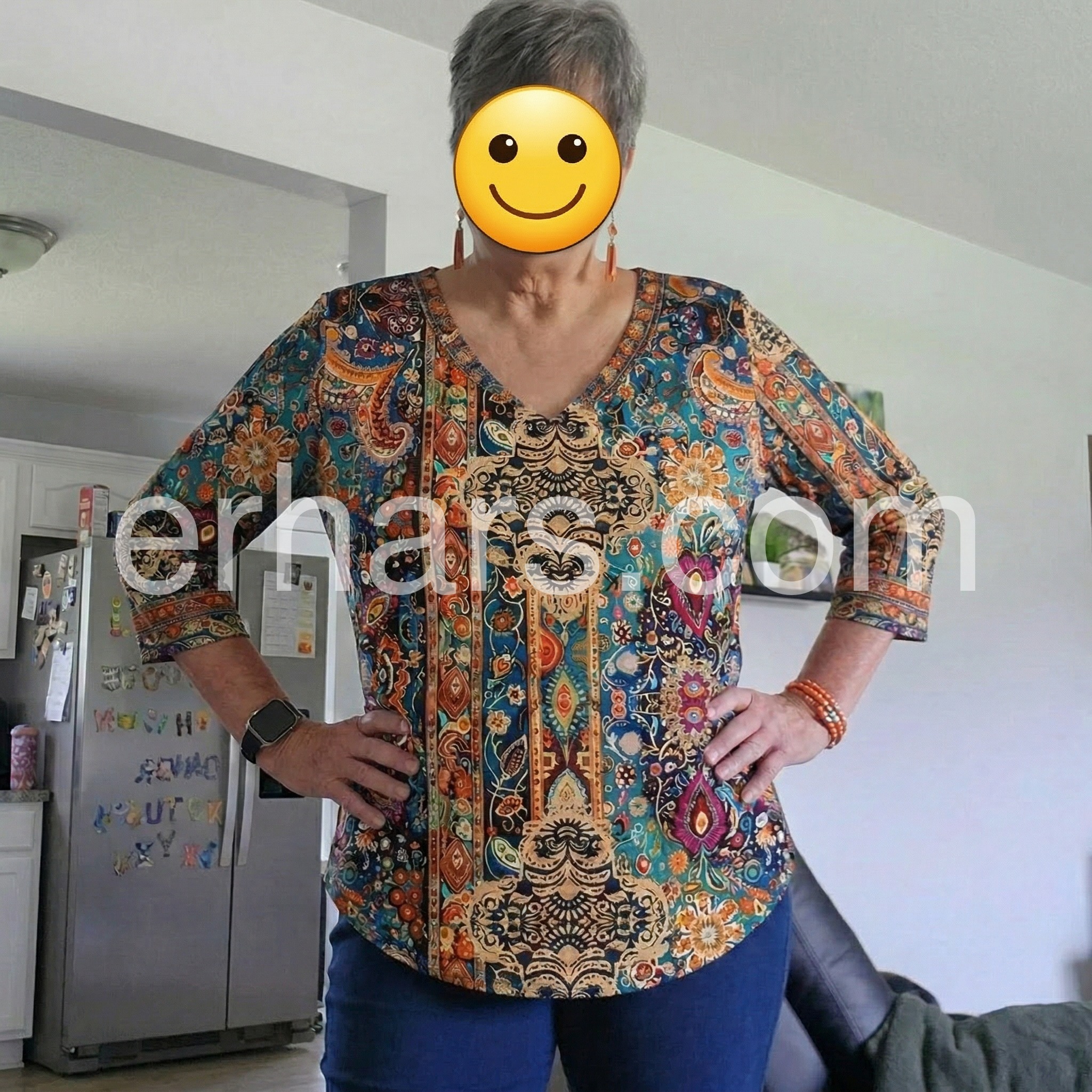 3/4 sleeve length is lovely for 65 plus ladies. Coulours are vibrant and the pattern is classy.