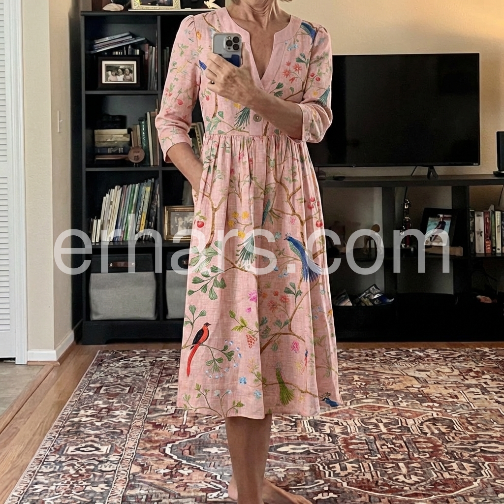 This three-quarter sleeve dress features a soft pink base with colorful birds and floral patterns. The V-neck and button front add vintage appeal. Side pockets offer comfort and convenience. Lightweight fabric perfect for spring and summer. Ideal for casual outings or garden parties.