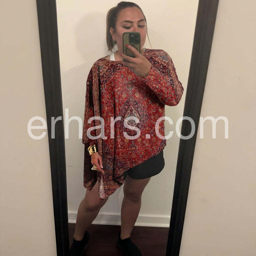 If you are looking for a top that is forgiving and stylish, this is it. The asymmetrical cut creates a lovely silhouette that elongates the body. The vintage rug pattern is gorgeous in person. Very happy with my purchase.
