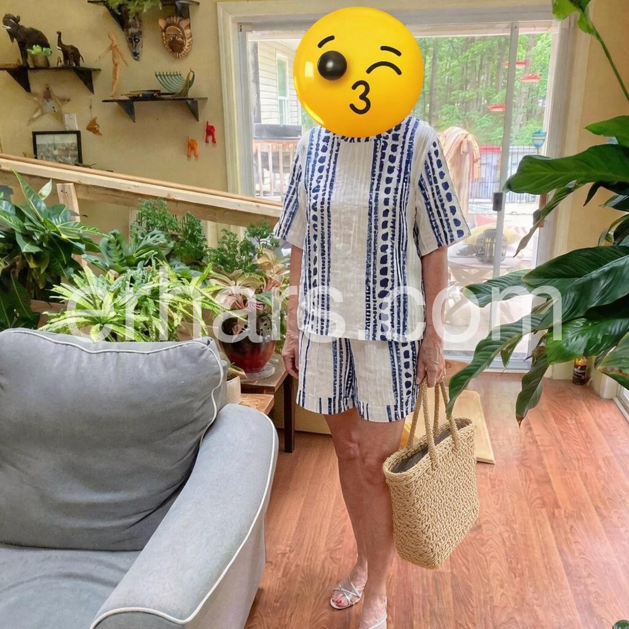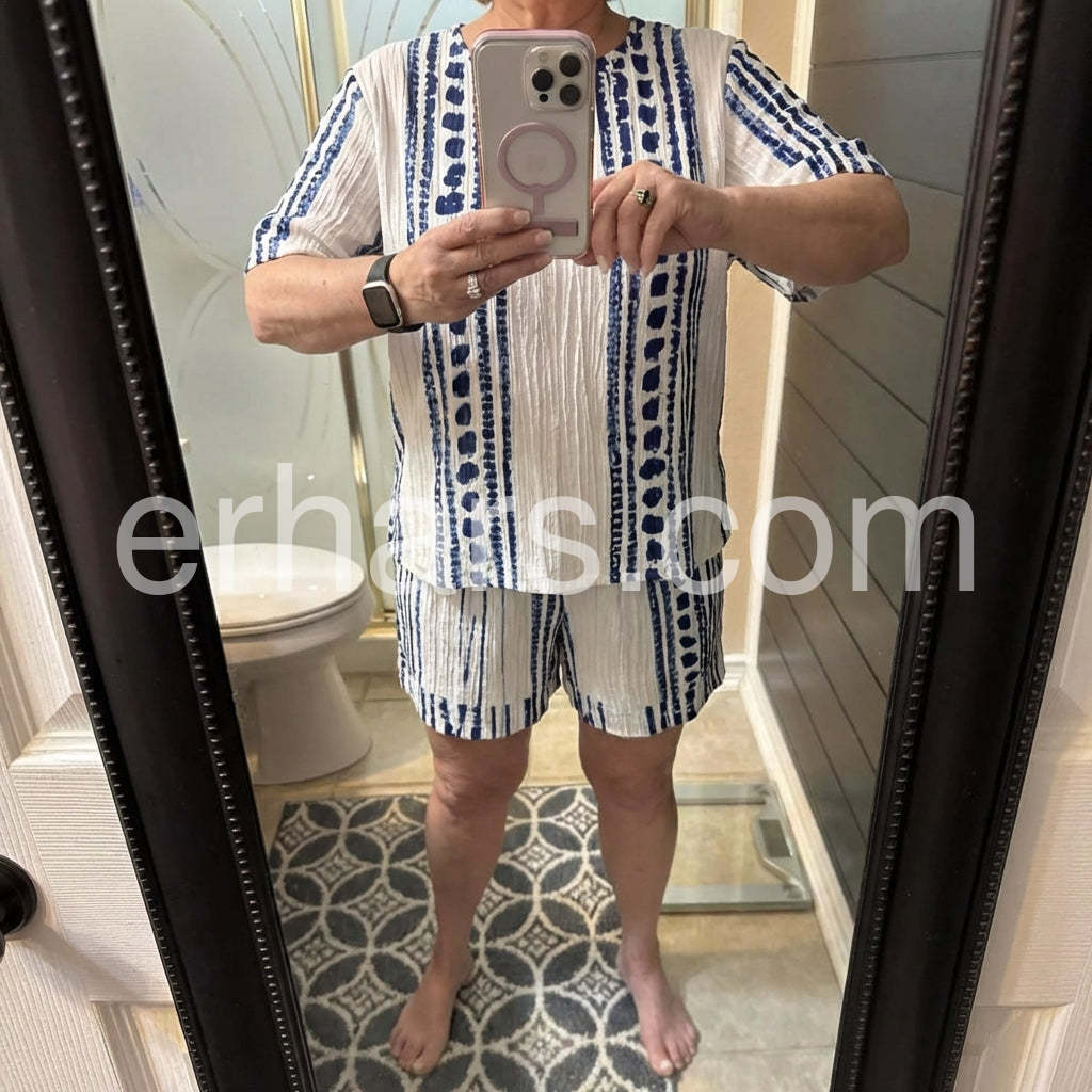 This matching set is absolutely delightful. The white and blue stripes look fresh and crisp, and the fabric feels light and breathableerfect for warm days. The fit is true to size, and the relaxed short silhouette is flattering and comfortable. The straw bag adds a perfect, tropical touch that ties the whole look together. Customer service was responsive, and delivery was quick, making the shopping experience smooth from start to finish. Highly recommend for a chic, effortless summer outfit.