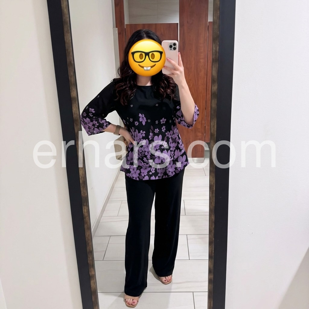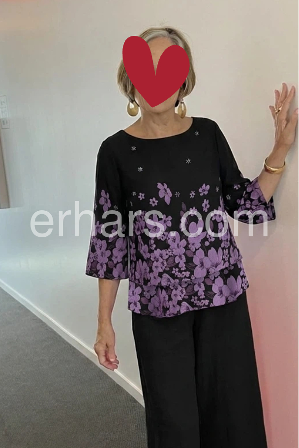 This two-piece set features a black top with a soft purple floral print and flowing sleeves. Paired with sleek, wide-leg pants for a relaxed yet polished look. Lightweight fabric perfect for warm days. Ideal for casual outings or garden events. Effortlessly stylish and easy to wear.