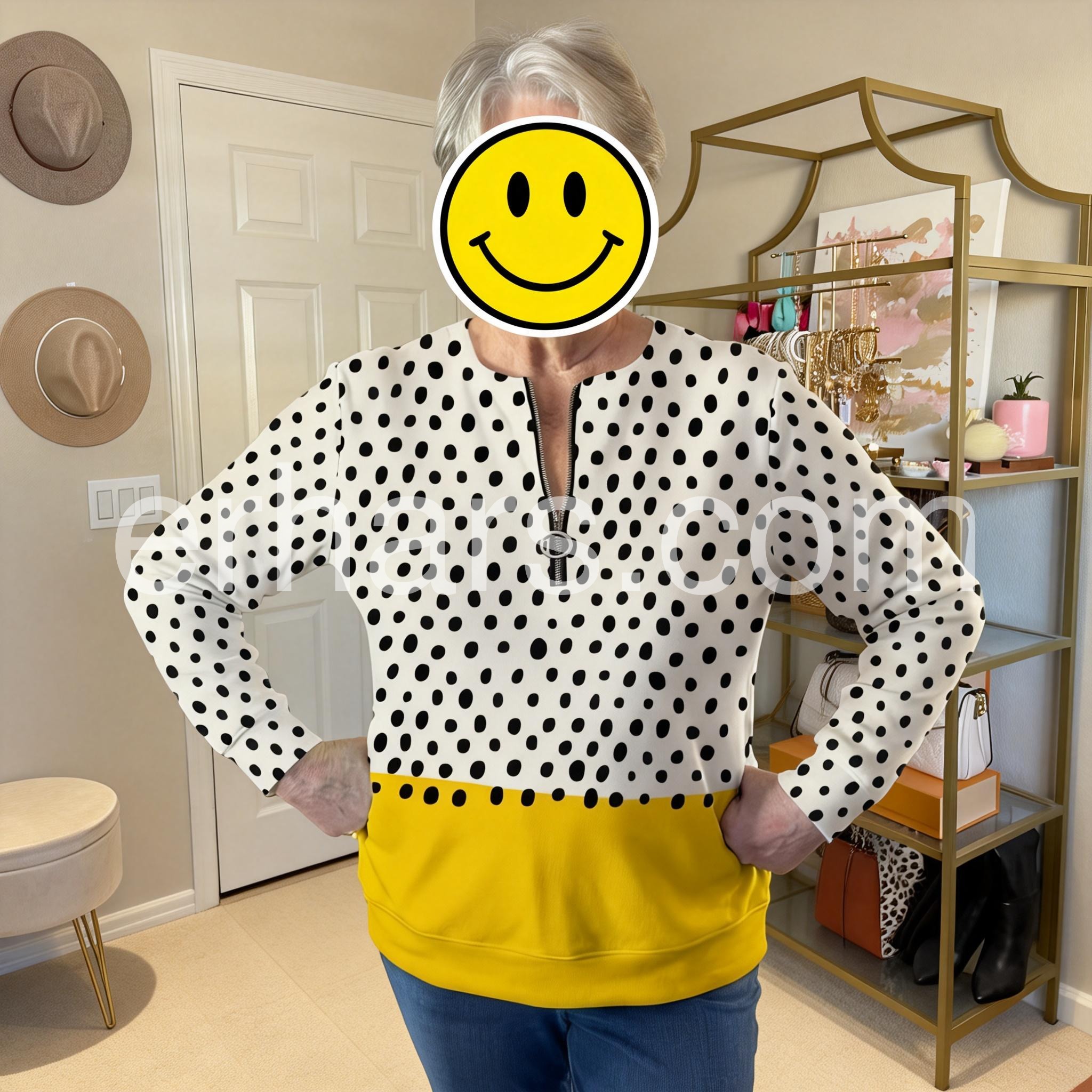 I absolutely love this top! The black and white polka dots are classic, and the yellow color block at the bottom adds such a fun pop of color. The zipper at the neckline is a cute detail. Fits true to size!