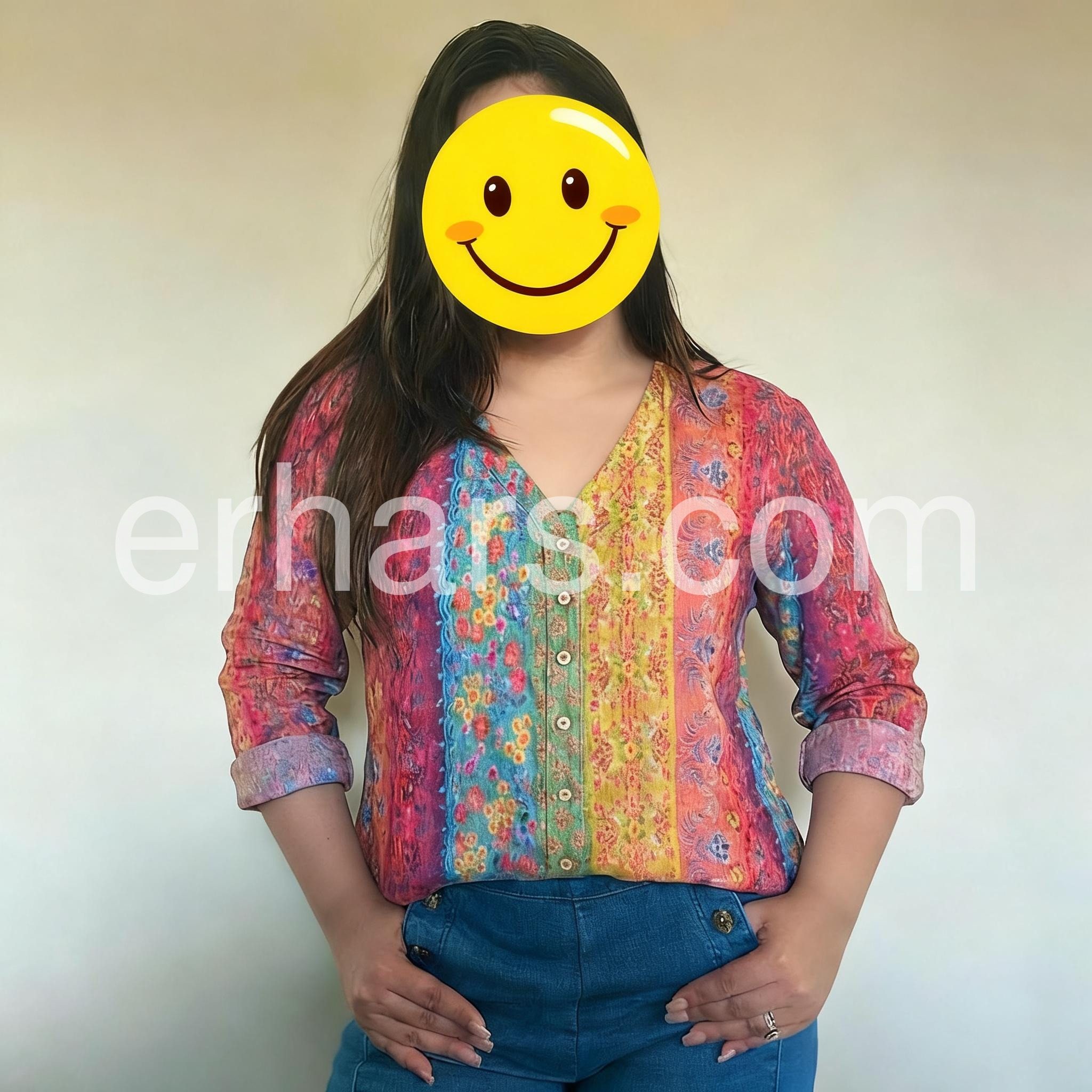 Embrace free-spirited style with this Stunning Colorful Boho Print Top, a vibrant and eye-catching piece that brings bold artistry to everyday wear. Crafted from lightweight, breathable fabric—likely cotton or rayon blend—this long-sleeve tunic features a richly detailed print combining floral motifs, paisley patterns, and vertical stripes in a lively mix of fuchsia, turquoise, mustard yellow, and deep purple. The relaxed, flowy silhouette drapes beautifully, offering comfort and ease while the V-neckline and front button closure add a touch of classic structure. With sleeves that roll up easily for a casual look, it’s perfect for pairing with jeans, leggings, or flowy pants. Styled here with layered necklaces and bracelets, it captures the essence of bohemian elegance with a modern twist. Ideal for weekend outings, summer days, or adding a burst of personality to your wardrobe, this tunic top celebrates color, culture, and effortless charm. Let your style shine with this joyful, artistic statement piece.