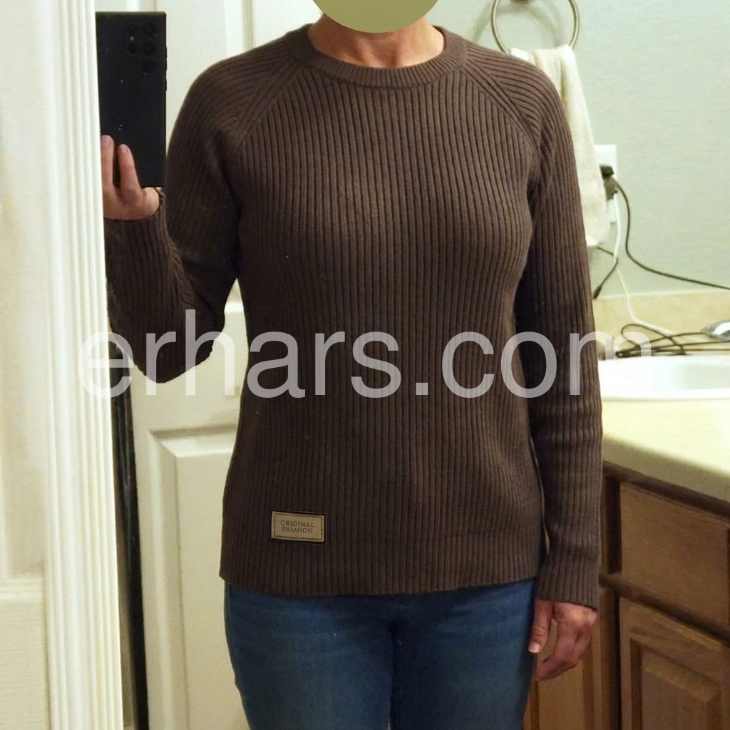 This dark brown ribbed sweater is such a wardrobe staple! I love the little \"Original Fashion\" patch detail—it gives it a casual, trendy vibe. The relaxed fit is flattering, and it pairs perfectly with jeans for everyday wear. It’s warm enough for cool days and lightweight enough for layering. I’ve gotten so many compliments already!